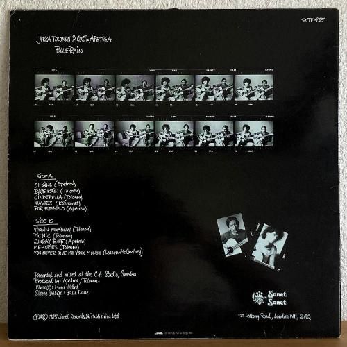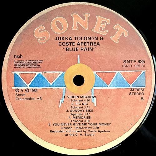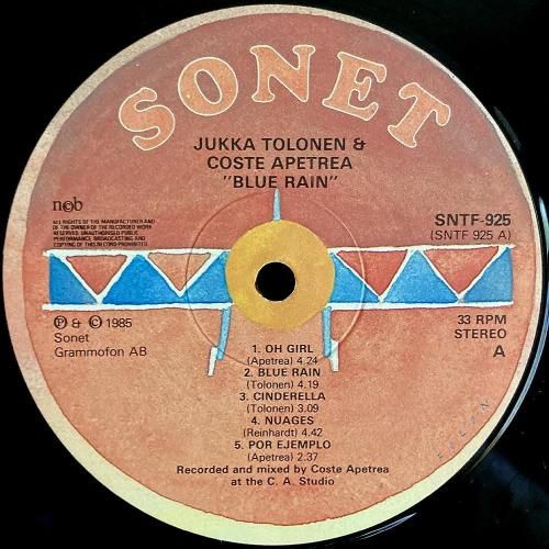 タイトルよろしく雨音を連想させるような、しっとりしたコードの優しいアンサンブルA2「Blue Rain」、ブルージーでスタンダードのように浮遊するメロディラインA4「Nuages」、奥行く音場がよく似合うビートルズカヴァーB5「You Never Give Me Your Money」など全10曲。Jukka Tolonen のジャズ/フュージョンのアプローチと、Costa Apetera のヨーロピアンで叙情的なスタイルが融合し、ハーモニーとメロディの掛け合いが非常によく練られた1枚。スカンジナヴィア盤。