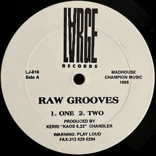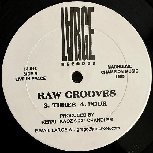 今や欧州大人気のUSプロデューサー Kerri Chandler の「Raw Groove」シリーズ初期作。95年リリース、シカゴのレーベル Large Records から。硬質なキックに、ゴムのように弾むベースライン、細かく刻みつつも音数は抑制されたハイハット、それぞれの“余白”で踊らせる全4曲。残響を活かしたスモーキーなB2「Four」も絶妙。ひとしきり盛り上がった後の深い時間に、朝に向かって再度始まっていく間際に効きます。US盤。