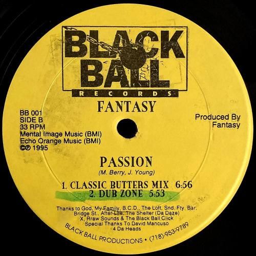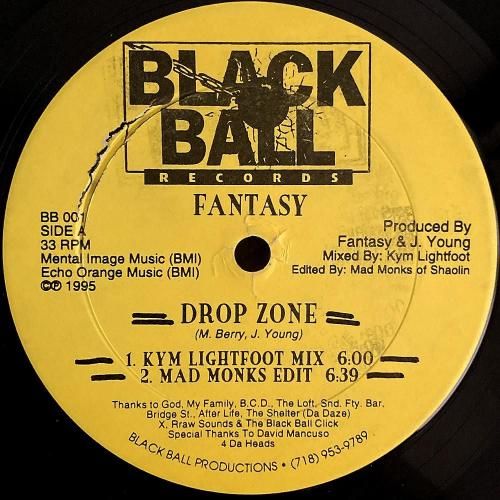 US/NYプロデューサー Marco A. Berry のプロジェクト Fantasy の95年作。この1作しかリリースされていませんが、多分自身のレーベル Black Ball Records からのリリース。いぶし銀 Kim Lightfoot によるリミックスA1「Drop Zone (Kym Lightfoot Mix)」は909系の骨格と残響で煙たすぎる NYCガラージ 真骨頂。ドープな低域とパーカッションを残して上モノを大胆に間引いたダブB2「Passion (Dub Zone)」など全4曲。地下臭プンプン。ラベルには「Special Thanks To David Mancuso」と表記。US盤。