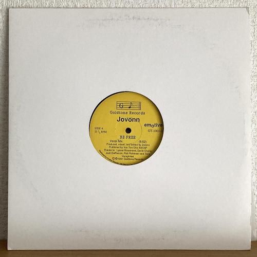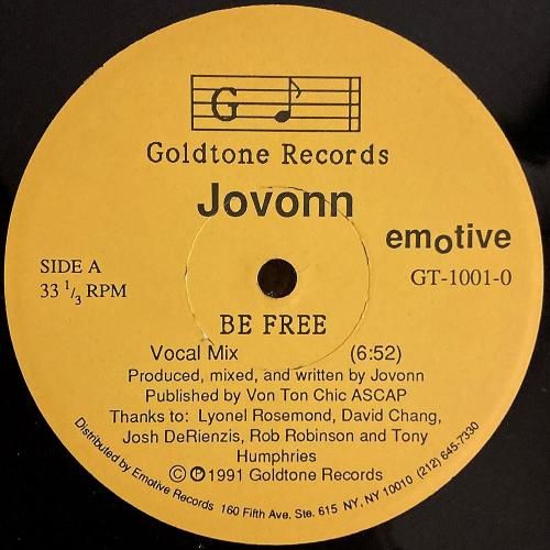 US/ブルックリンプロデューサー Jovonn こと Allen Jovonn Armstrong の91年名曲。当時自身のレーベルだった Goldtone Records からのリリース。「Be Free」というスピリチュアルかつコミュニティ指向のメッセージとミニマルな機能美に満ちたA「Be Free (Vocal Mix)」、グルーヴだけで空間の温度を上げるツール性際立つB「Be Free (Instrumental Mix)」の全2ミックス。ゴスペルの根を感じさせる“Be Free”の呼びかけが、フロアの一体感を導く名曲。US盤。