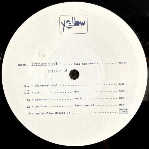 仏プロデューサー Shazz と、USハウスを代表するプロデューサーチーム Blaze による共作。1998年リリースで、フレンチ・ハウスを牽引したレーベル Yellow Productions から登場した一枚です。A1「Innerside (Artform Vocal Mix)」は、Blaze らしい直角に落ちるキックに、しなやかに絡むベース、そしてソウルフルなヴォーカルがしっかり映える王道の仕上がり。A2「Innerside (Artform Instrumental Mix)」では、スペーシーな鍵盤が主役となり、よりDJユースなムードに振れています。全4ヴァージョンを収録した、まぎれもない名曲。フランス盤。